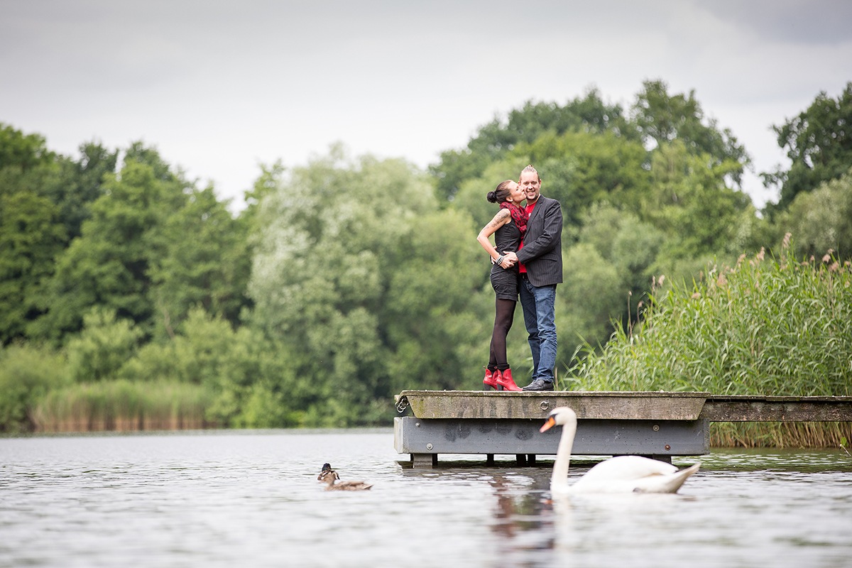 Annika und Dennis haben mich vor kurzem angerufen weil sie ein paar schöne Fotos für die Einladungskarten ihrer Hochzeit haben wollten. Da ich auch ihre Hochzeit fotografieren soll nutzten wir gleich die Gelegenheit und trafen uns zu einem sogenannten Engagement Fotoshooting. Ein Engagement Shooting vor der eigentlichen Hochzeit finde ich als Hochzeitsfotograf sehr wichtig,wichtig für mich aber auch für das Hochzeitspaar. Während eines solchen Fotoshootings können sich beide Seiten ein wenig kennenlernen. Da man am Hochzeitstag ja etliche Stunden miteinander verbringt finde ich es sehr wichtig zu sehen ob man auch zueinander passt. Was nützt es einen wenn der Hochzeitsfotograf schöne Fotos machen kann man sich aber eigentlich nicht riechen mag! Abgesehen vom Kennenlernen und den schönen Fotos die die beiden nun haben konnten wir die Gelegenheit auch gleich nutzen um einige Details und Wünsche für ihre Hochzeit zu besprechen. Für diese Pärchenbilder sind wir einfach stressfrei ohne Druck bei mir daheim in Oldenburg um den Flötenteich gelaufen und haben locker drauf los fotografiert.